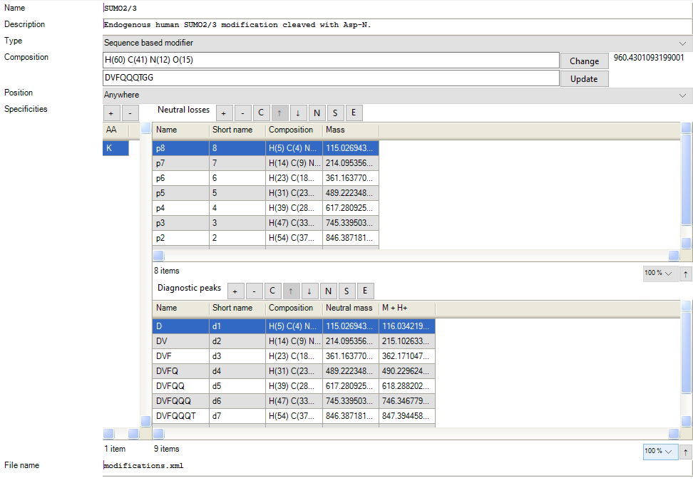 Figure 1. The configuration for including a SBM in a search is done by including a variable modification with the type “Sequence based modifier”, and defining a set of neutral losses and diagnostic ions. The diagnostic peaks and neutral losses can be calculated automatically by defining an amino acid sequence in the GUI.